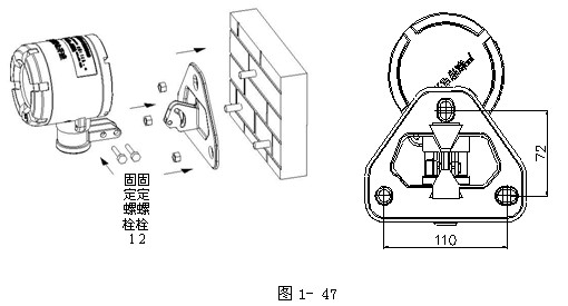 探 測器的安裝方式有兩種,一種是安裝在墻壁上,另一種是安裝在頂棚上。探測器附件備有卡箍和壁板,用于探測器的安裝,卡箍和壁板結構示意圖如圖1-47所 示。壁板用三個M660的膨脹螺栓直接固定在墻壁或者頂棚上,卡箍用來連接探測器和壁板。通過調節探測器和卡箍,可以使探測器向上轉動18°,向下轉動 50°,左右轉動各90°。安裝時,先把卡箍套在探測器的支撐軸上,然后通過固定螺栓1將卡箍連接到壁板上,接好探測器連接線。調節探測器和卡箍,使探測 器正對被保護區域,然后擰緊固定螺栓1和固定螺栓2,將探測器固定好。