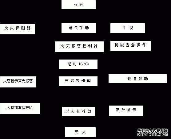 狀態。這時,當火災探測器發出火警信號時,控制器即發出火災聲、光報警信號,而不啟動滅火裝置,需經人員觀察,確認火災已發生時,可按下保護區外或控制器操作面板上的“緊急啟動按鈕”,即可啟動滅火裝置,釋放滅火劑,實施滅火。但報警信號仍存在。